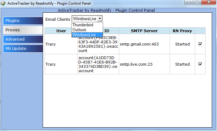 Some email programs (such as Windows Live Mail) are not compatible with plugins. For those, or if you have problems with the plugins, you can use proxy settings instead to add tracking to your emails. In the “Proxies” page choose your email program from the drop-down list and check the box to ‘Start’ the relevant proxy.